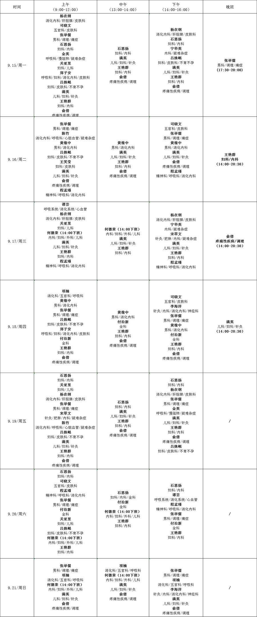 2025年9月15日-9月21日同济堂中医院专家出诊时间表