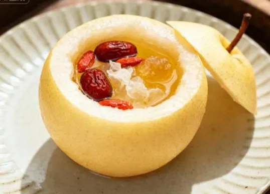 功效:清热化痰。生津润燥。 材料:鲜梨子1个,红枣5颗,银耳、枸杞适量。上述材料洗净,梨子去皮去核放入杯中,加银耳、枸杞、红枣,放进烤箱烤1小时。