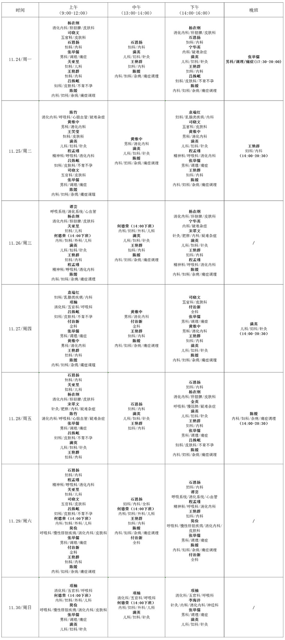 2025年11月24日-11月30日专家出诊时间表