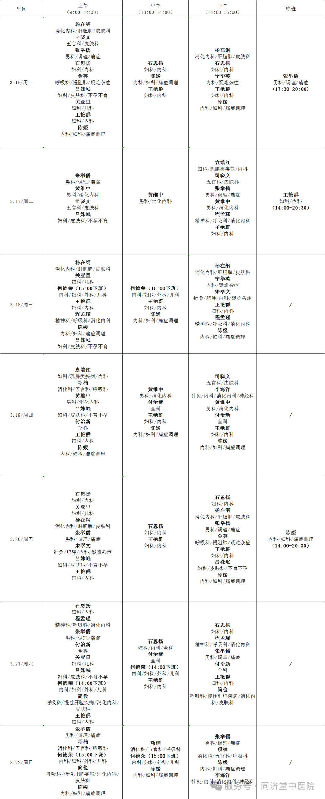 2026年3月16日-22日同济堂中医院专家出诊时间表